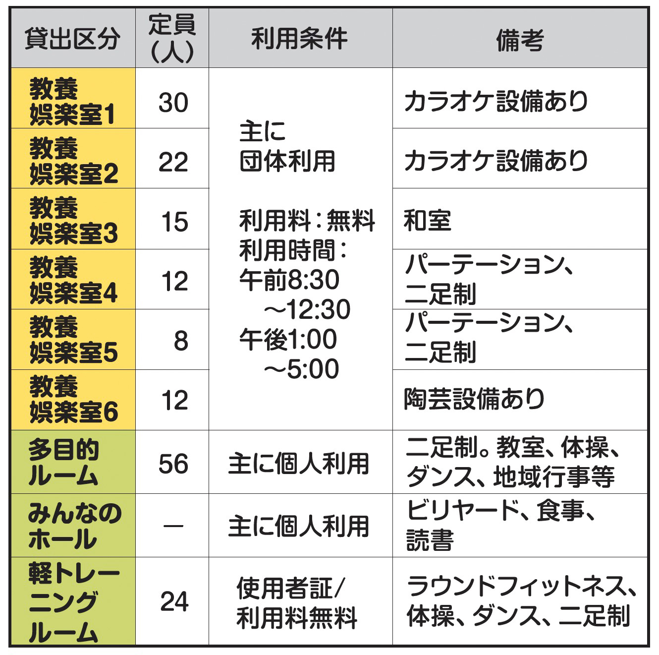 •個人利用料は1回あたり60歳以上の市民100円、60歳未満市民200円、その他300円(団体利用料は1回2時間あたり同条件で1,600円・3,200円・4,800円)